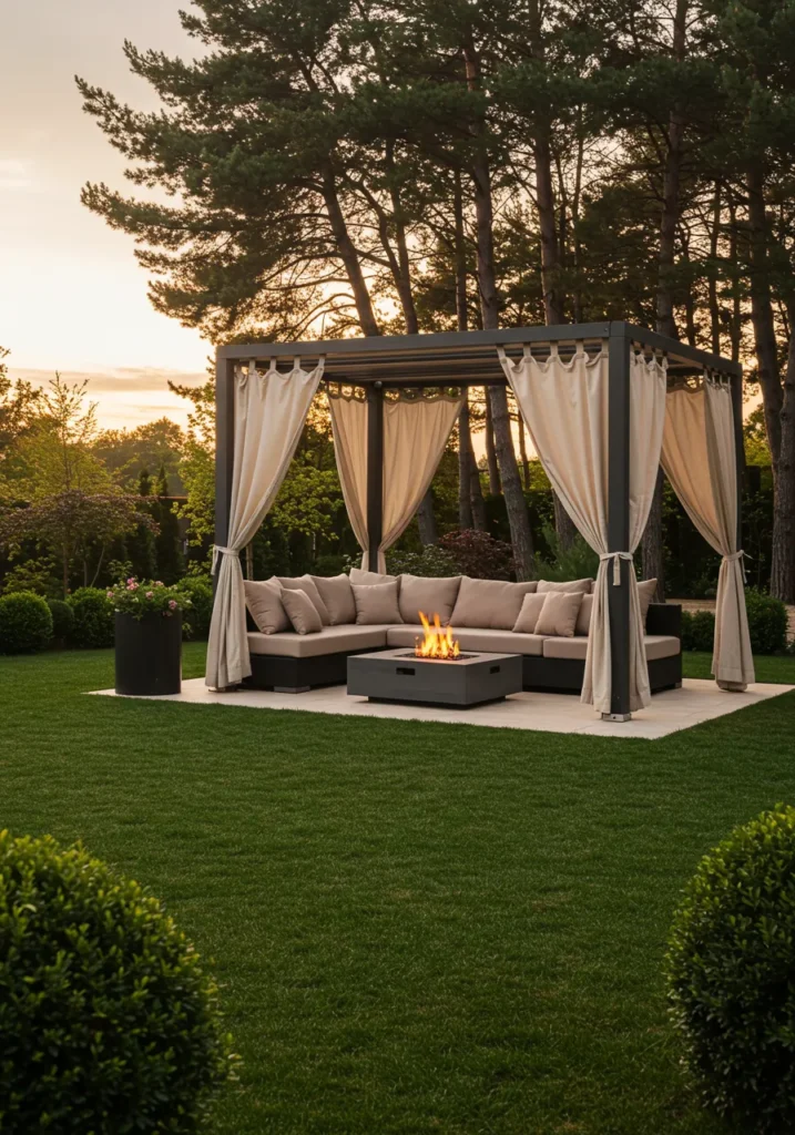 I just love how this design brings everything together—comfort, style, and nature. The fire pit adds that perfect touch for cozy nights, and the soft flow of the curtains just gives it a serene, almost magical vibe. Honestly, this is the kind of backyard where I’d want to spend all my time, whether it’s with friends or enjoying some me-time. It’s a gorgeous blend of elegance and relaxation, and I think anyone would be lucky to have a space like this!