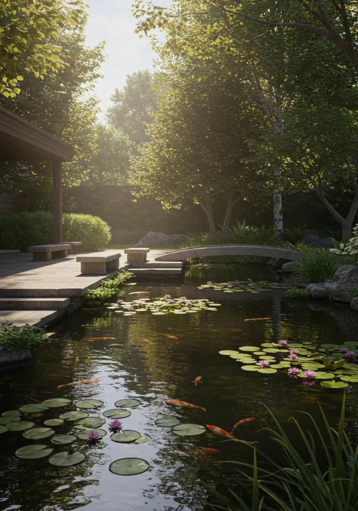 What makes this design truly enchanting is the balance between natural beauty and thoughtful landscaping. The water lilies and koi fish add a touch of elegance and life to the space, while the stone bridge brings a touch of classic charm. I love how this backyard feels like a quiet escape, perfect for a reflective afternoon or a romantic evening stroll. The soft light filtering through the trees enhances the tranquil vibe, and it’s one of those spaces that just invites you to relax and unwind. It’s definitely a gorgeous spot to disconnect and enjoy some peace and serenity!