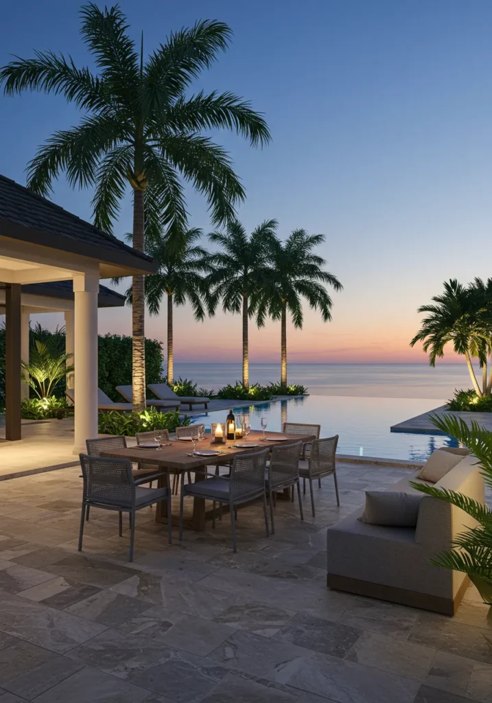 This luxurious backyard design features a stunning infinity pool that seamlessly blends with the horizon, offering uninterrupted views of the ocean or a similar stunning landscape. Palm trees line the space, enhancing the tropical feel while providing a touch of shade. The outdoor dining area is thoughtfully positioned next to the pool, with a sleek table and comfortable seating for enjoying meals or entertaining guests in style. The soft lighting adds a warm ambiance, perfect for evening gatherings as the sun sets.