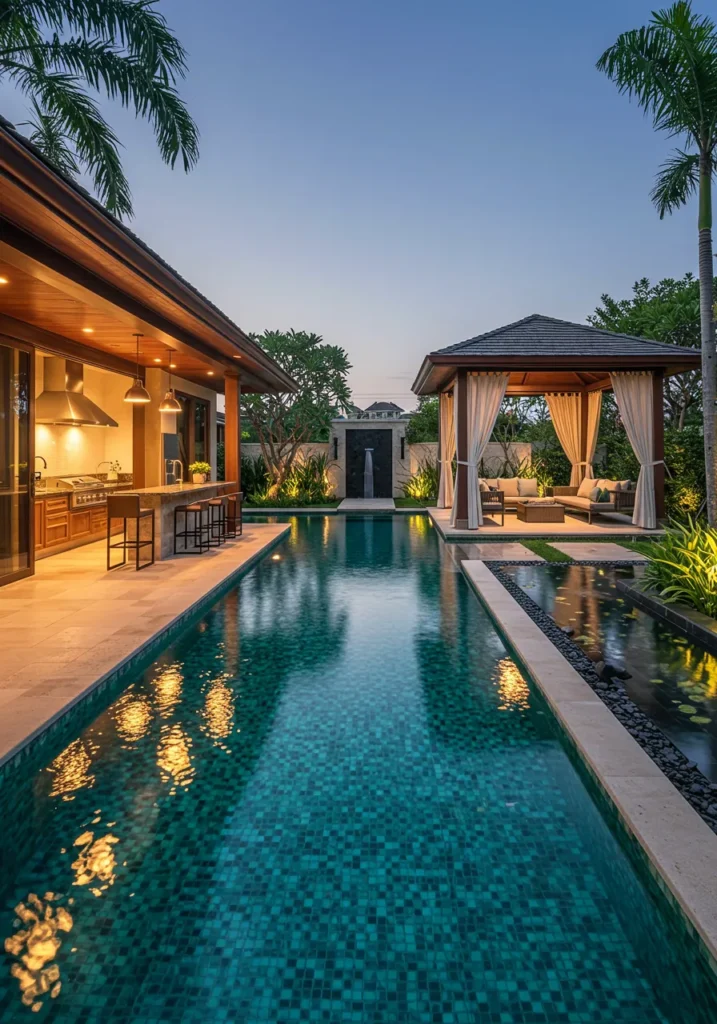 This backyard design combines luxury and functionality with an elegant swimming pool running alongside a spacious outdoor kitchen. The pool’s sleek, blue tiles reflect the surrounding tropical greenery, and the water glistens under the soft evening lighting. On the other side, a cozy gazebo invites you to relax, with soft curtains swaying gently in the breeze. The outdoor kitchen is perfect for hosting dinner parties, complete with a modern grill and stylish barstools. The soothing sound of the nearby water feature adds to the peaceful ambiance, creating the ultimate retreat.