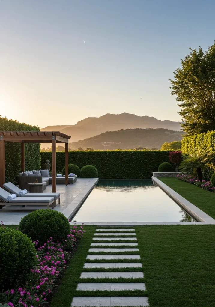 This stunning backyard features a sleek and minimalist pool that mirrors the clear skies and majestic mountains in the background. On one side of the pool, a charming pergola offers a shaded seating area, where you can relax on plush lounge chairs while soaking in the panoramic views. Lush greenery lines the perimeter of the space, with neatly trimmed hedges and vibrant flowers creating a colorful contrast against the clean, modern lines of the design. The stepping stones leading to the pool give it a peaceful, inviting feel, making it the perfect spot for both quiet contemplation and entertaining.
