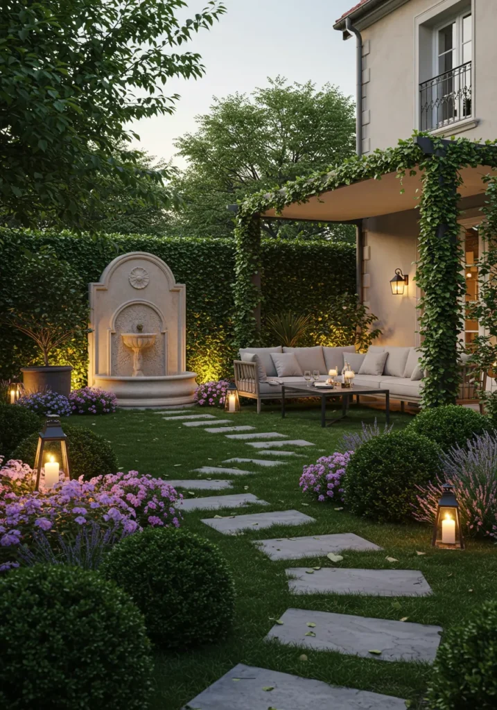 What I absolutely love about this design is how it mixes formal beauty with relaxed comfort. The fountain is a showstopper, making the entire space feel serene and peaceful, while the low-maintenance greenery brings a sense of order and calm. It’s the perfect balance of beauty and practicality, with the lighting adding just the right amount of warmth. The space feels so inviting, making it the perfect spot for quiet moments or even gathering with friends. I can just picture myself lounging here with a glass of wine, enjoying the soft sound of the water and the fresh, tranquil atmosphere. It’s the ideal place to unwind!