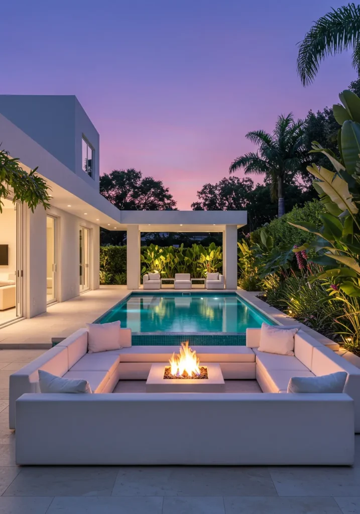This luxurious backyard design centers around a sleek and modern pool, perfect for a refreshing swim or a peaceful moment by the water. A spacious outdoor lounge area with clean, white seating surrounds a contemporary fire pit, offering warmth and ambiance as the sun sets. The surrounding tropical plants and soft lighting enhance the serene vibe, creating a stunning backdrop for any evening. The minimalist design of the pool and furniture lets the natural beauty of the space shine through, blending comfort with style effortlessly.