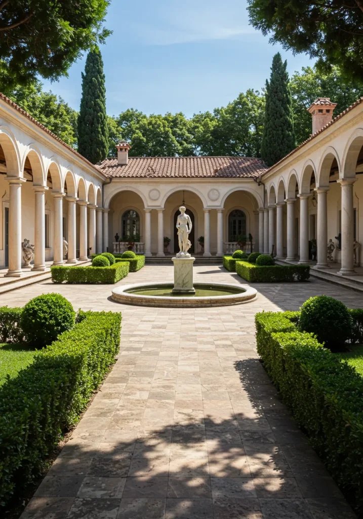 Elegant Courtyard with Sculptures and Fountain