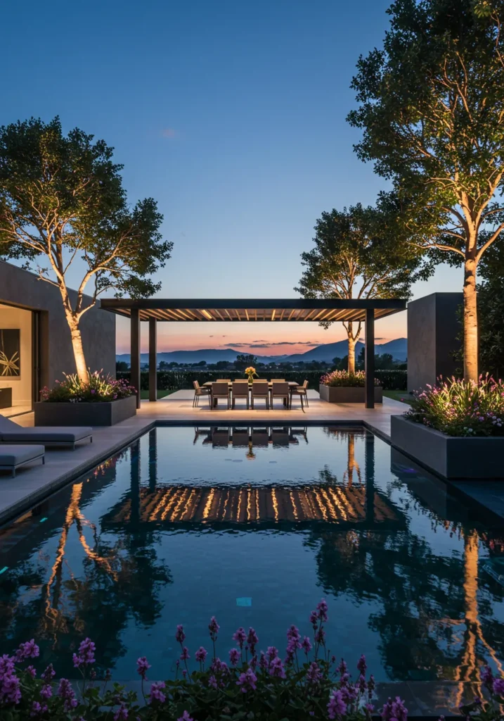This stunning backyard combines sleek modern architecture with breathtaking natural beauty. A stylish dining area is covered by a contemporary pergola, offering a perfect place to enjoy meals while soaking in the panoramic views of the surrounding mountains. The long, reflective pool mirrors the open sky, adding a sense of tranquility to the space. The lush landscaping with vibrant flowers and sculpted trees brings the design to life, while ambient lighting at night casts a warm glow, creating an inviting atmosphere for evening gatherings.