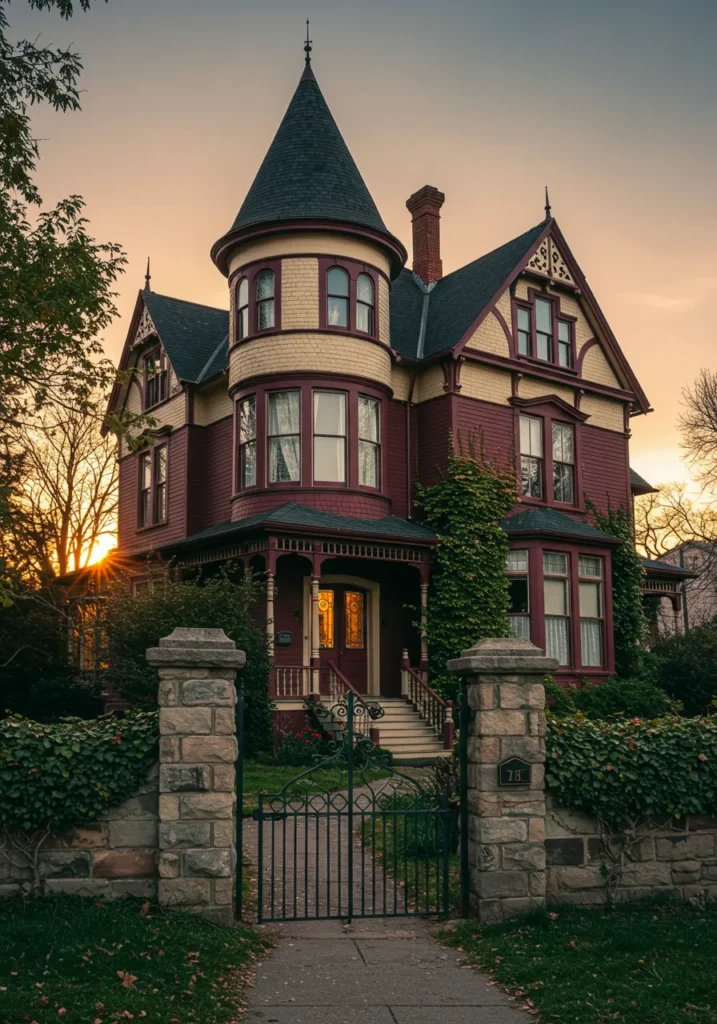 This stunning Victorian house blends rich historical elements with modern details. Its striking deep burgundy exterior paired with light cream accents gives it a regal and timeless feel. The house boasts intricate woodwork, steeply pitched roofs, and a charming turret, all features synonymous with classic Victorian architecture. The lush greenery surrounding the property, including ivy creeping up the stone pillars at the entrance, enhances the old-world charm, creating a romantic, storybook vibe.