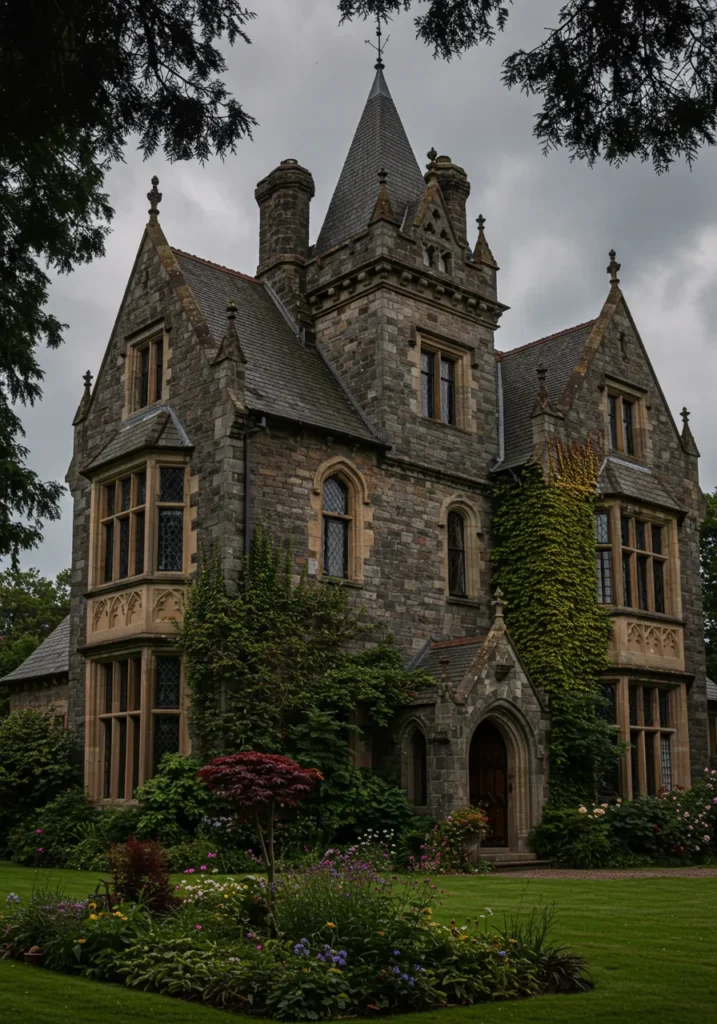 This stunning Gothic Revival mansion stands tall with its dark, weathered stone exterior, giving it a dramatic and mysterious presence. The tall, pointed towers, intricate window tracery, and arched doorways exude timeless grandeur and a sense of history. Ivy creeps up the walls, softening the stonework and adding a touch of nature’s beauty to the imposing structure. Surrounding the mansion is a lush garden filled with vibrant flowers, adding a delicate contrast to the bold architecture.