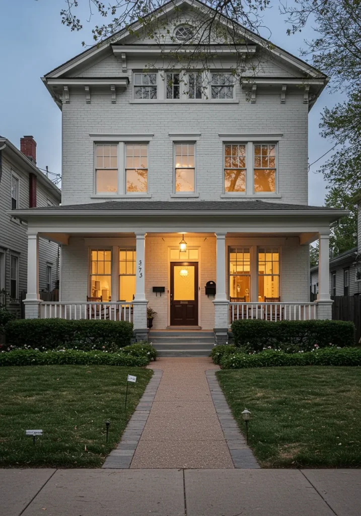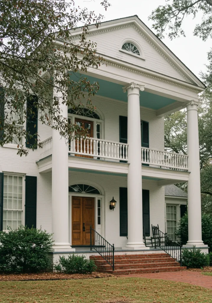 This Southern Colonial-style mansion exudes elegance, with its pristine white brick exterior and grand columns that frame the entrance. The wide porch with a delicate railing offers the perfect spot to relax and take in the view of the lush, manicured lawn. Tall windows adorned with classic black shutters provide a beautiful contrast to the light-colored brick. The intricate detailing around the door and the charming lanterns on either side of the entrance add warmth and a touch of grandeur to this beautiful home.