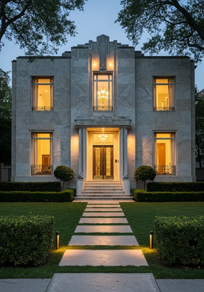This stunning Art Deco-inspired home radiates sophistication with its sleek marble exterior and geometric design elements. The bold lines and symmetry of the structure are highlighted by warm lighting that casts a golden glow on the steps leading to the grand entrance. The towering windows create an open, airy feel, while the lush, well-manicured lawn and topiary shrubs add a touch of nature to balance the modern aesthetic. The detailed ironwork on the windows and door frame give the house a sense of refined luxury.
