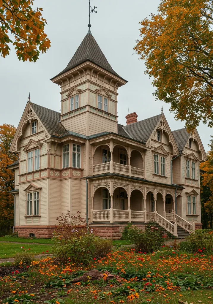 This Victorian Gothic-style mansion is the epitome of grandeur, with its dramatic pointed roof, intricate stonework, and towering spires. The house is framed with ornate wooden trim and delicate carvings that add an air of mystery and elegance. Large, arched windows with diamond-shaped panes create a sense of openness, while the lush, flower-filled garden brings life to the otherwise stately structure. The rich combination of warm wood and cool stonework makes this home feel both inviting and regal.