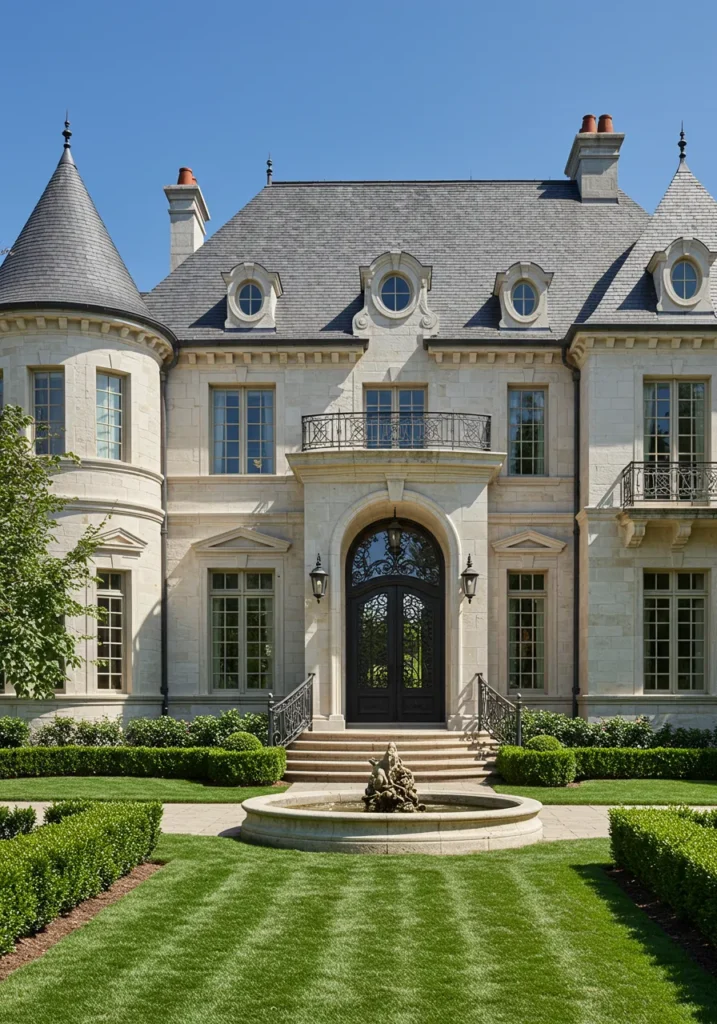 This opulent French chateau-style mansion is nothing short of breathtaking, with its grand dome-shaped roof and intricately designed stonework. The smooth stone façade is beautifully complemented by tall, rounded windows, while the graceful balcony above the entrance adds a touch of refinement. The symmetrical design, with a majestic staircase leading up to the front door and a fountain adorning the front garden, creates a sense of regal luxury. The manicured hedges and geometric garden beds enhance the beauty and elegance of the home.