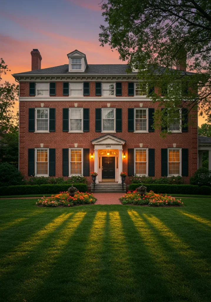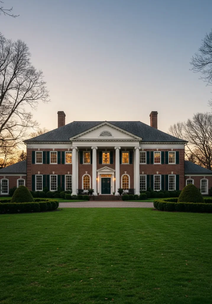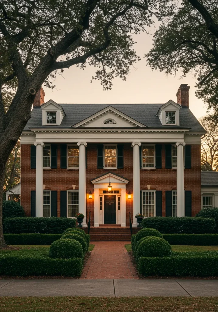 This stunning Southern colonial home features a red brick facade with perfectly symmetrical columns and large white windows. The imposing front porch is flanked by classic, crisp black shutters and two lantern-style light fixtures that glow warmly as the sun sets. A well-manicured garden with neatly shaped hedges leads to a grand entrance, complete with a dark green door framed by decorative woodwork. The clean lines of the house combined with the lush greenery give it a stately yet welcoming presence.