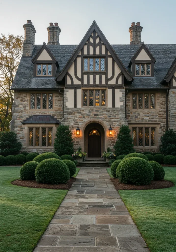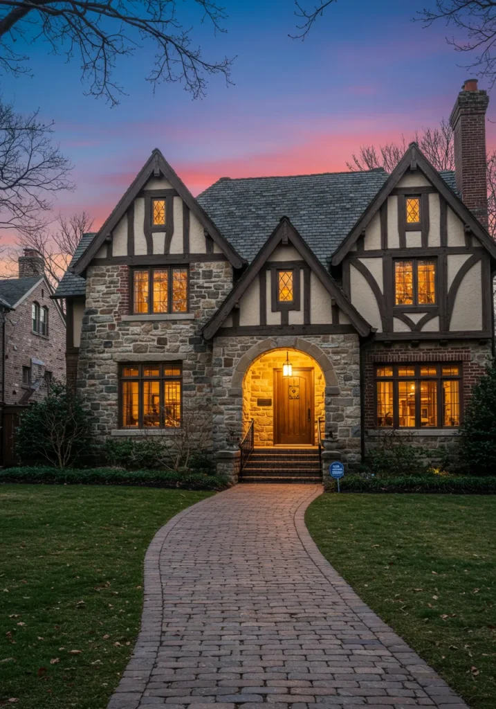 This charming English Tudor-style home blends rustic stonework with delicate wood accents for a truly inviting and classic look. The steep gabled roof, exposed wooden beams, and diamond-shaped windowpanes give the house an old-world feel, while the earthy tones of the stonework and trim make it warm and approachable. The lush green lawn and carefully landscaped front yard lead up to a stately, arched doorway, framed by lanterns that add a soft glow to the evening atmosphere.
