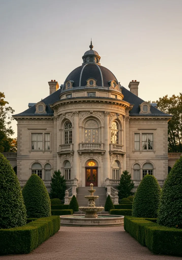 I’m completely captivated by this design! The classic French elegance combined with the beautiful, well-maintained garden gives the home a peaceful yet luxurious feel. The curved dome on the roof adds such a unique and striking architectural element, while the perfectly balanced symmetry of the windows and columns creates harmony. This home is a true showstopper—it’s timeless and stately, with all the charm and grandeur one could dream of in a luxury estate. I can easily picture an evening stroll through the garden with the fountain softly running in the background—pure bliss!