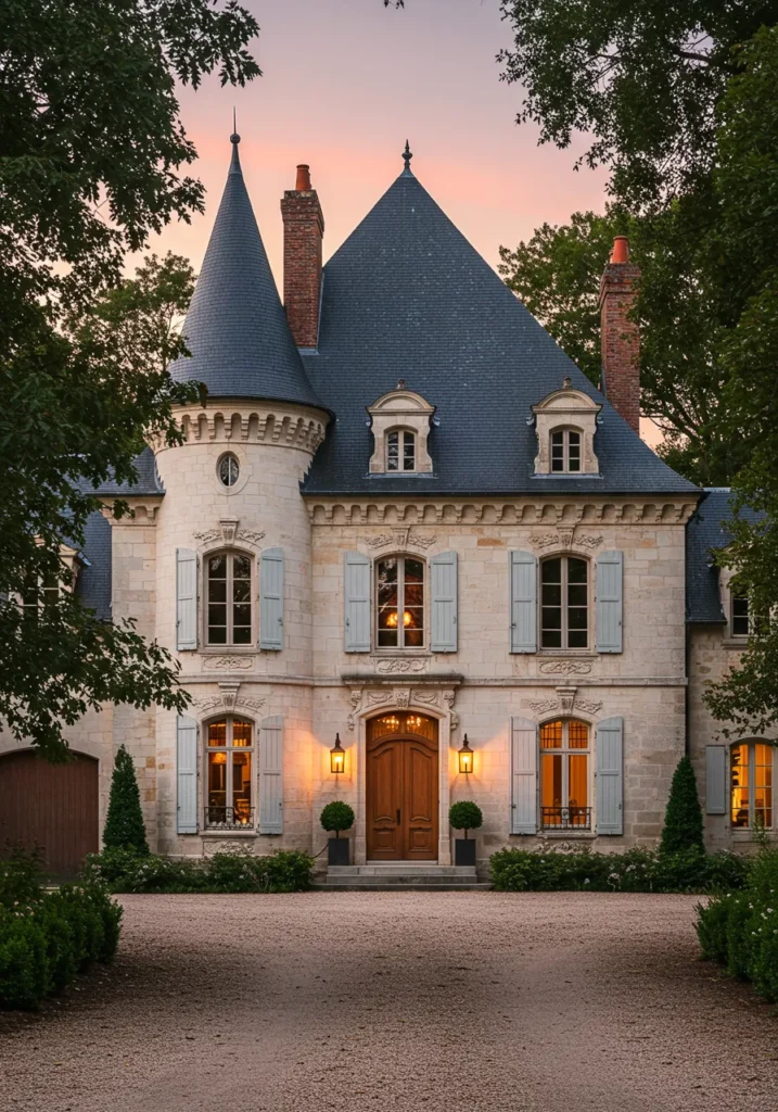 This charming French chateau features classic old-world charm with a refined, regal touch. The house is adorned with a soft stone facade, accented by blue shutters and large windows, creating a welcoming yet sophisticated look. The beautifully arched front door stands as the focal point, flanked by antique-style lanterns that add a cozy ambiance in the evening light. The pointed turrets and delicate rooflines give it a fairytale-like appearance, blending seamlessly into the lush green landscape that surrounds it.