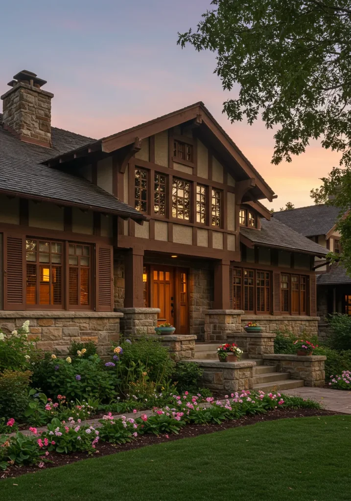 This gorgeous Tudor-style home features a beautifully detailed stone facade with contrasting dark wooden beams. The steep gabled roof and charming arched windows give it an air of elegance, while the warm lighting coming from the windows invites a sense of comfort and intimacy. The lush garden with vibrant flowers and manicured hedges leads up to the stone steps that guide you right to the front door. The overall design captures the timeless beauty of traditional Tudor homes, creating an atmosphere that is both stately and welcoming.