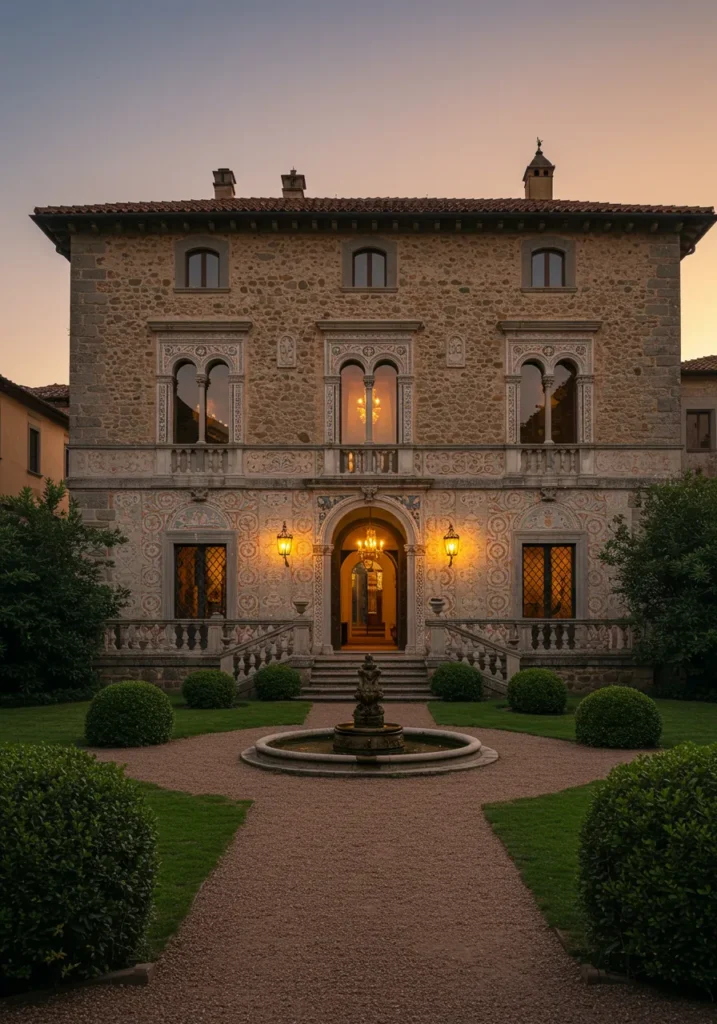 This stunning villa showcases classic Italian architecture, with a beautifully textured stone facade and intricately carved details around the windows and doors. The home is perfectly framed by lush, symmetrical gardens and a central fountain, evoking feelings of grandeur and timeless elegance. The grand entrance is complemented by a pair of matching lanterns and an inviting staircase, which leads to the warm glow of the home’s interior. The intricate details in the stonework and the elegant arches truly highlight the refined craftsmanship that went into this design.
