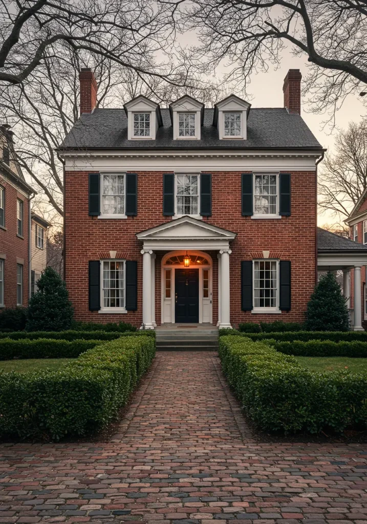 This home effortlessly blends traditional and timeless design with its striking red brick exterior and classic white accents. The large windows are framed with bold black shutters, creating a contrast that draws the eye upward to the elegant, symmetrical roofline. The grand entrance, with its inviting porch supported by white columns, leads to a beautifully lit doorway. A neatly paved path of red bricks adds to the welcoming atmosphere, creating a sense of warmth and charm from the very first glance.