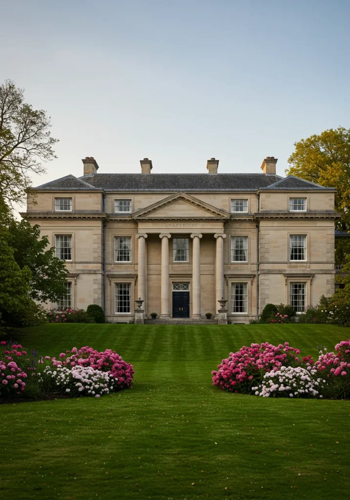 This stunning Georgian-style home stands proudly with its symmetrical design, perfectly framed by tall white columns that adorn the front entrance. The light stone facade and large, evenly spaced windows evoke a sense of classical grandeur. A beautifully manicured garden, complete with a colorful flowerbed, leads up to the elegant porch, adding to the home’s regal presence. The simple yet striking architecture makes a bold statement with its balance and harmony.