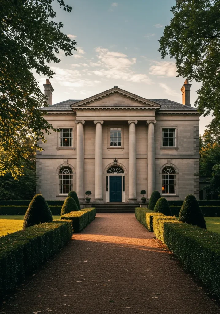 This neoclassical mansion exudes timeless elegance with its grandiose front entrance, framed by towering white columns that rise impressively above the entrance. The stone facade, perfectly complemented by the classic blue door, is surrounded by neatly manicured greenery and symmetrical landscaping. The path leading to the front door is lined with vibrant greenery, adding warmth and charm to the overall stately design.