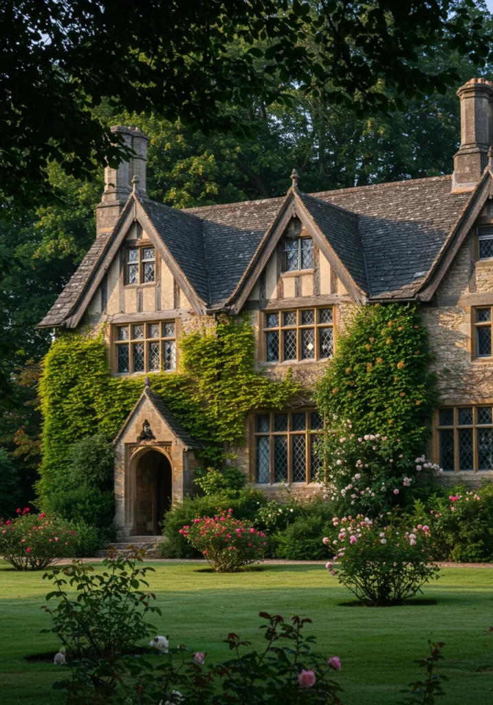 This beautiful English cottage features the perfect blend of rustic charm and refined elegance. With its stunning stone exterior, classic Tudor-style beams, and steep gabled roof, the house feels like something straight out of a fairytale. The lush greenery that climbs the walls, combined with colorful rose bushes lining the front garden, adds a sense of serenity and romance. The pointed arched door and diamond-shaped windows create a unique focal point, bringing a touch of historical charm to the overall design.
