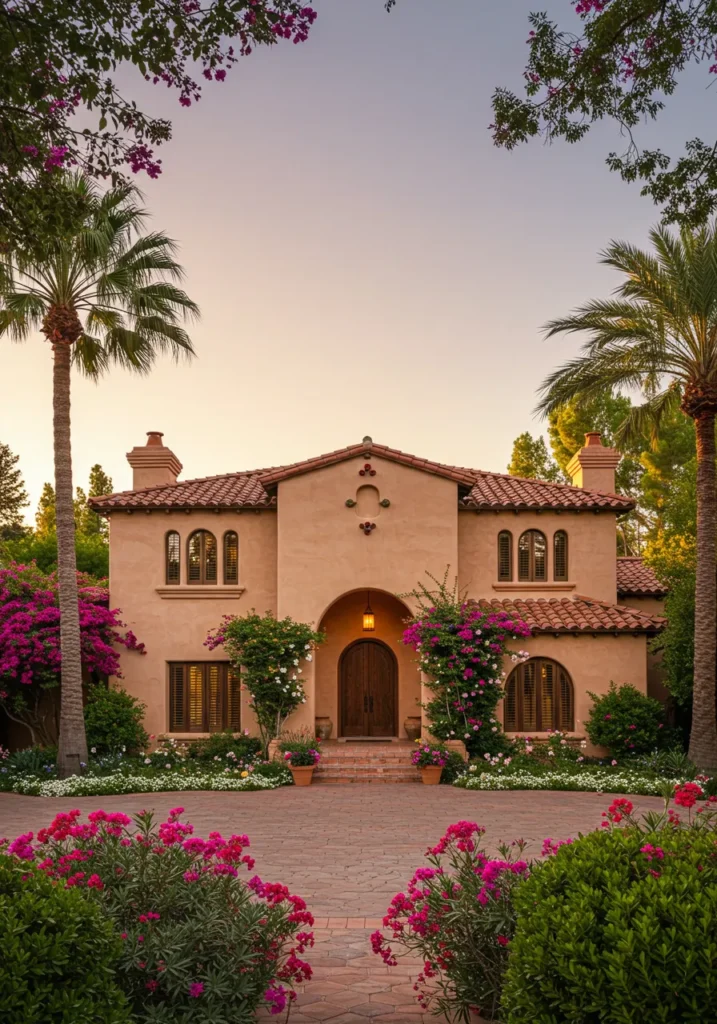 This beautiful Mediterranean-style villa radiates warmth and charm, enhanced by its earthy stucco exterior and classic red tile roof. The archway entrance is framed by lush flowering plants that add vibrant color to the scene, while the tall palms and ivy-covered walls create a serene, tropical atmosphere. The symmetry of the large arched windows and carefully placed potted plants on either side of the door gives the house a balanced, welcoming look. The cobblestone pathway leading up to the entrance adds a rustic, timeless touch.