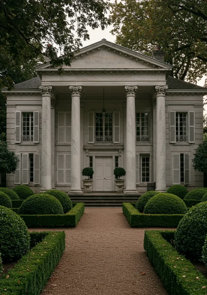 This grand neoclassical home boasts a striking white marble facade and towering columns that instantly command attention. The symmetrical design, complete with large, clean windows and perfectly manicured hedges, creates a sense of balance and order. The large staircase leads to a regal front door, flanked by two topiary trees in elegant urn planters. The meticulous landscaping, with its precisely shaped hedges and gravel pathway, enhances the home’s classical beauty, giving it a stately, timeless appeal.