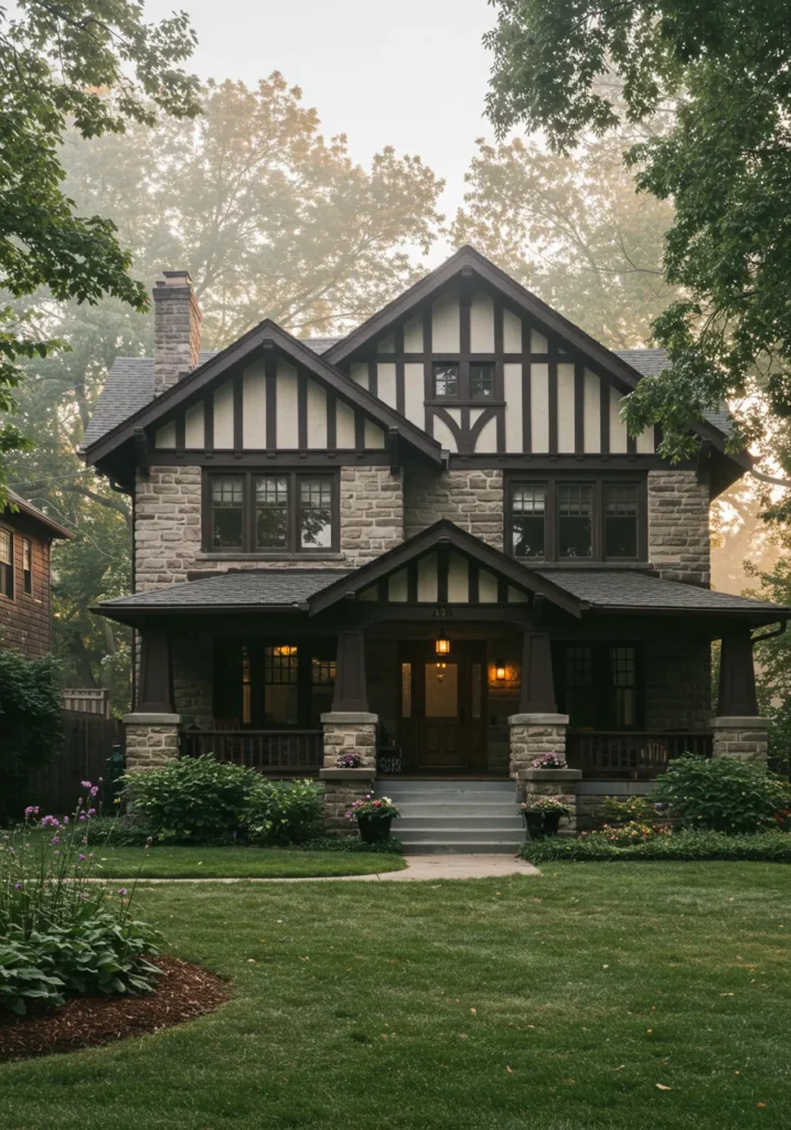 I find this design so captivating because of its perfect combination of rustic charm and architectural beauty. The half-timbering and stone give it an almost medieval vibe, while the well-maintained garden adds a fresh and lively touch. It’s a home that feels timeless, yet full of character. Every little detail, from the steep roofline to the front porch, is carefully crafted to make a statement, and I can’t help but picture cozy evenings spent in such a beautiful, inviting space!