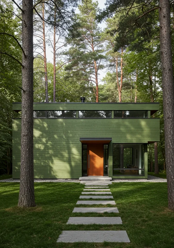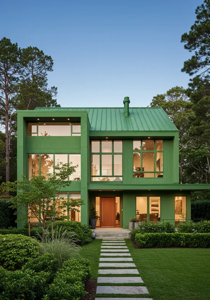 This modern green house exudes sophistication and style with its bold color and sleek design. The rich green exterior contrasts beautifully with the clean, sharp lines of the windows and trim. The roof is topped with a sleek metal covering, while the well-manicured garden adds a soft, welcoming touch. Large windows on the front give the house an open and airy feel, while the stone path leads up to the inviting entrance, making it clear that this home is designed with both beauty and function in mind.
