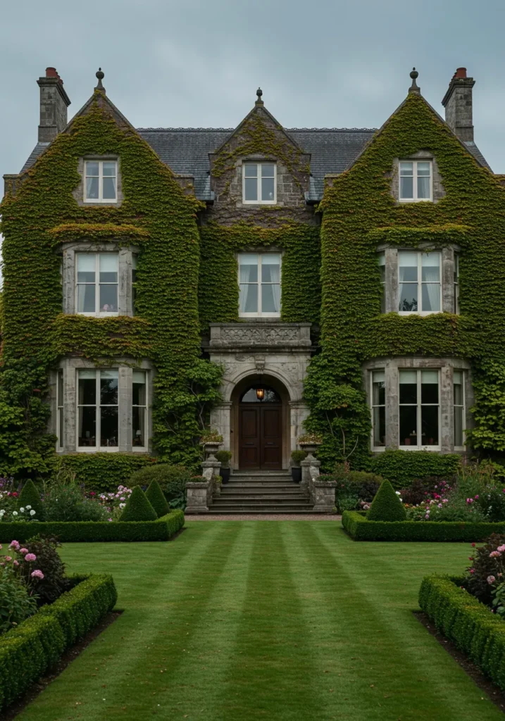 This charming manor exudes old-world elegance, with a green exterior that perfectly blends into its lush surroundings. The ivy climbing up the stone walls creates an enchanting, almost magical vibe, making the home feel like it belongs in a fairytale. The traditional architecture is complemented by the beautiful garden in front, with manicured hedges and colorful flowers leading up to the grand front entrance. The tall windows and stone details add depth to the design, creating a home that feels both stately and welcoming.