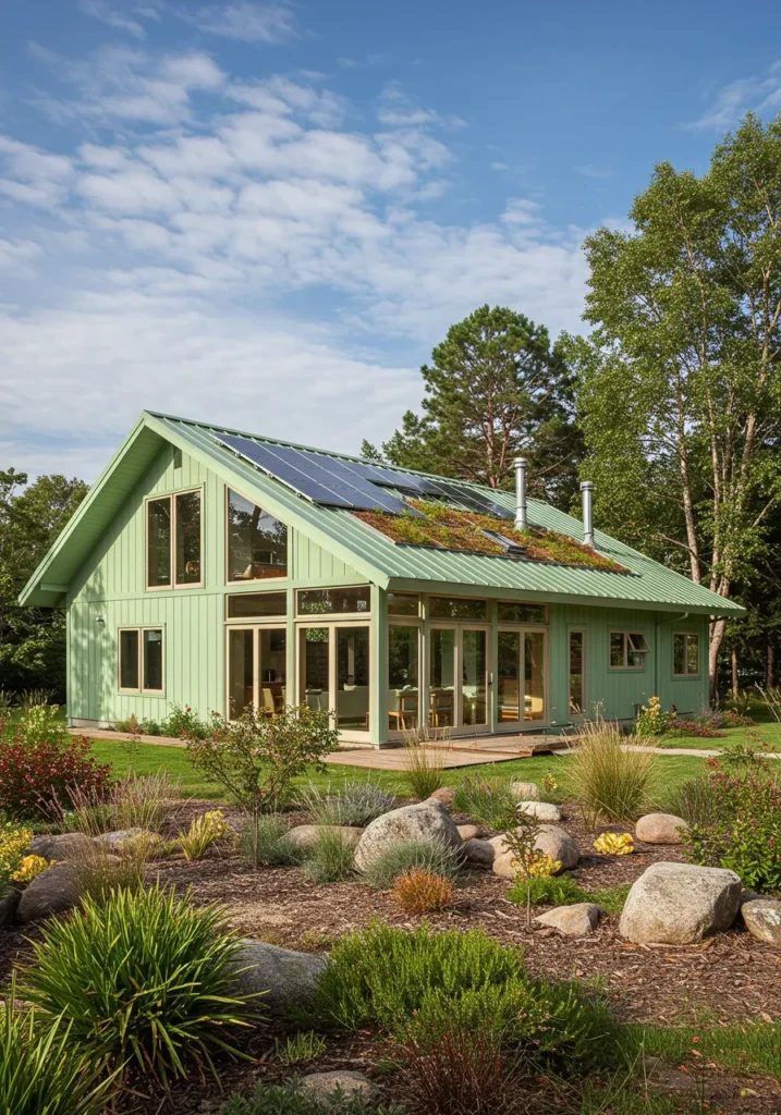 This eco-friendly green home is a beautiful blend of sustainability and modern design. The light green exterior pairs beautifully with the clean lines and large glass windows, allowing natural light to flood the interiors. What stands out most is the solar roof, which not only adds a unique architectural feature but also promotes energy efficiency. The surrounding garden is thoughtfully designed with a mix of greenery, rocks, and colorful plants, offering a peaceful outdoor retreat that complements the natural feel of the home.