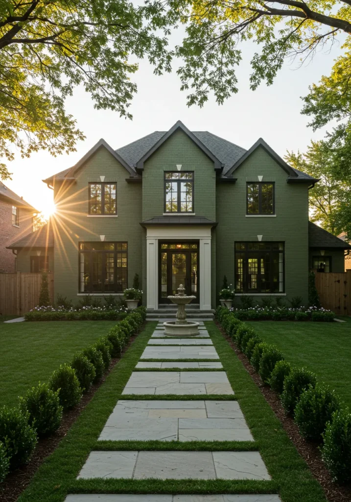 This elegant green home features traditional architecture with modern flair, making it a true statement piece. The rich green brick exterior is perfectly complemented by white window frames and a classic front entry. A charming stone fountain marks the center of the well-maintained garden, flanked by neat rows of boxwood hedges that lead up to the front door. The clean lines of the walkway, framed by lush greenery, give this home a welcoming and sophisticated feel, creating a beautiful focal point in the neighborhood.