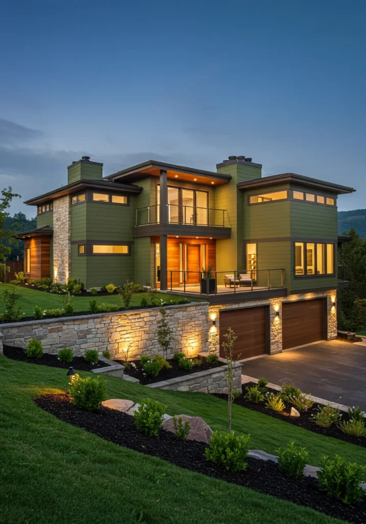 This contemporary home beautifully balances modern design with a touch of nature. The rich green exterior complements the sleek, angular structure, giving the house a stylish, almost futuristic appearance. Large windows, along with clean lines and metal accents, create a sophisticated look while seamlessly integrating into the surrounding landscape. The stonework at the base adds an earthy element, grounding the overall design and enhancing its visual appeal. The well-lit exterior, especially at dusk, highlights the home’s elegant form, inviting a cozy yet chic atmosphere.