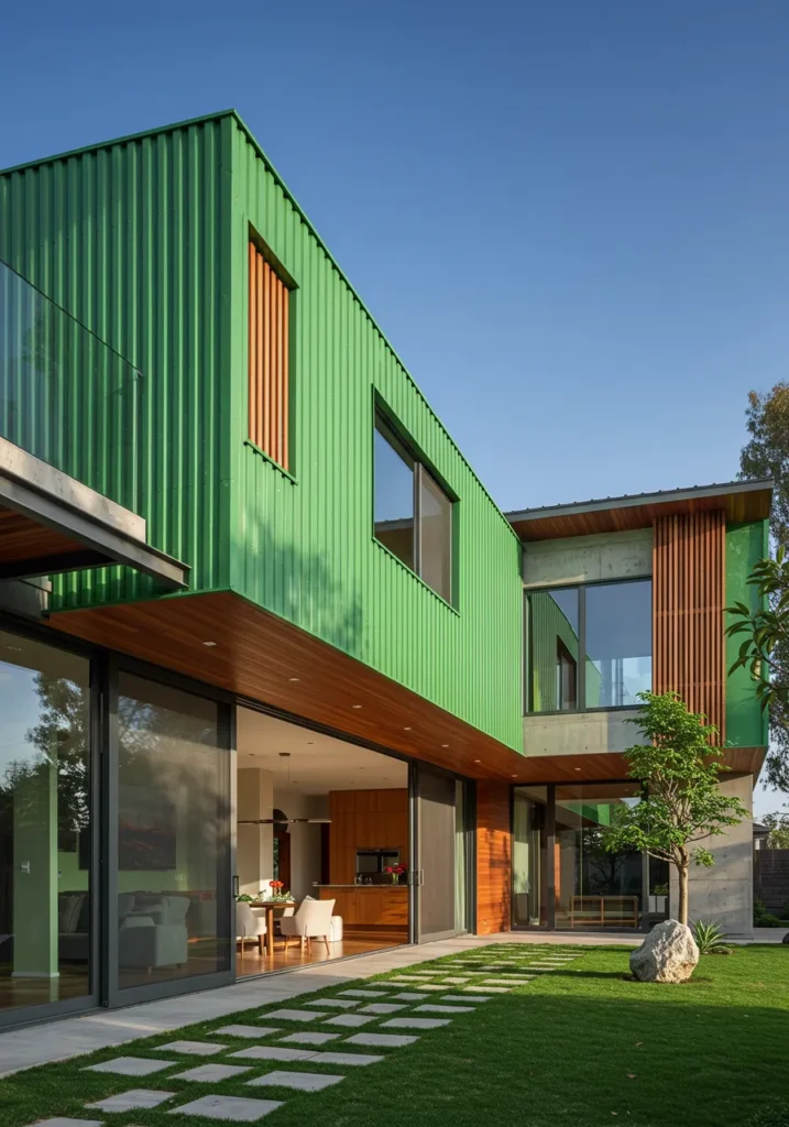 This modern home makes a bold statement with its vibrant green exterior and industrial design elements. The corrugated metal panels give the house a sleek, urban feel, while the warm wooden accents balance the look and add a touch of nature. Large windows allow plenty of natural light to flood the open interior, creating a seamless connection between the inside and the garden. The pathway leading up to the house, framed by perfectly manicured grass, enhances the clean, contemporary lines of the design.