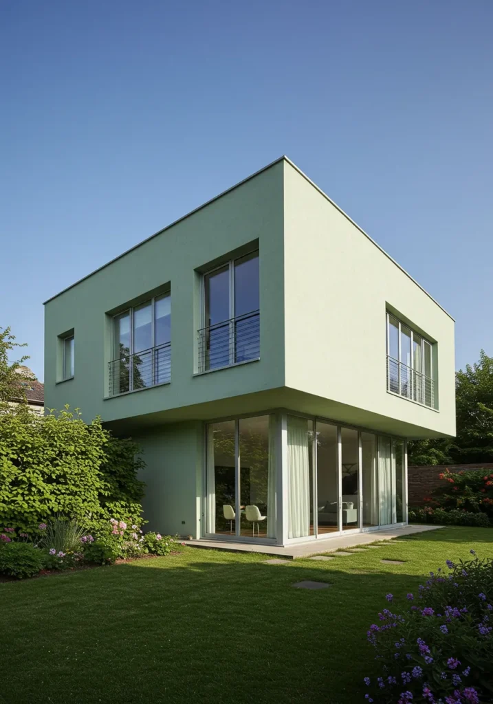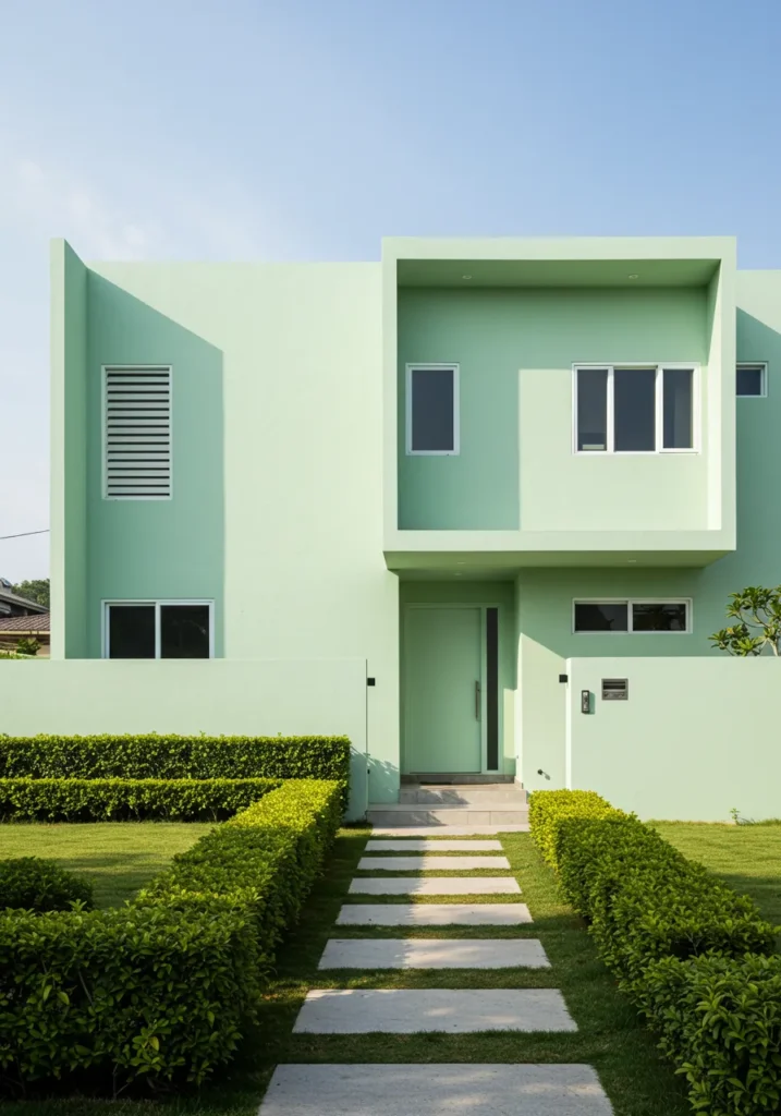 This minimalist green home is a standout with its sleek design and modern architectural features. The exterior is a soft pastel green, giving it a clean, fresh look, while the sharp lines and geometric shapes add a sense of sophistication. The large windows open the home to natural light, and the simple, well-maintained landscape provides the perfect setting for this contemporary beauty. The narrow, symmetrical pathway leading up to the front door adds a modern touch, guiding you through the perfectly manicured lawn.