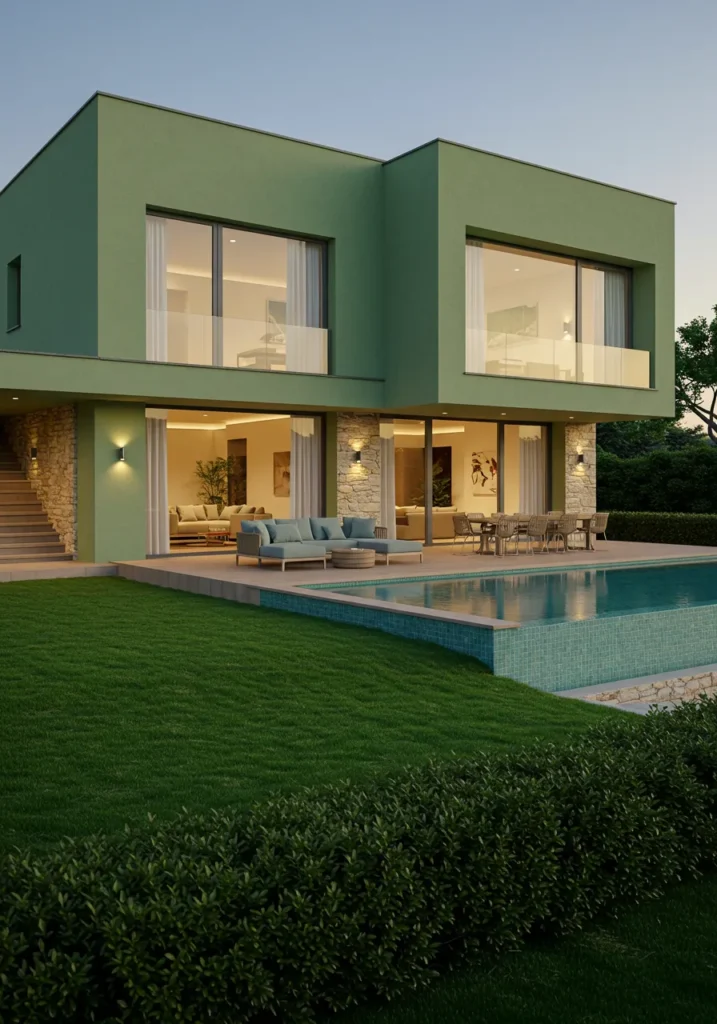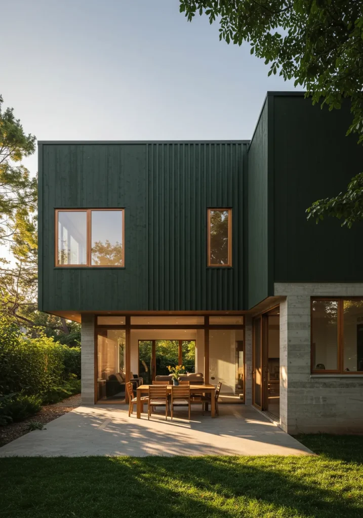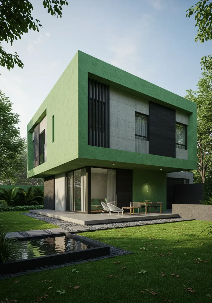 This stunning modern home stands out with its sleek green exterior, giving it a fresh, contemporary look. The sharp lines and geometric shapes of the architecture are balanced by large glass windows that allow natural light to flood the space. The minimalist design is complemented by a lush garden that frames the home perfectly, creating a serene and inviting atmosphere. A simple yet elegant patio area with clean-cut grass adds to the overall modern charm.