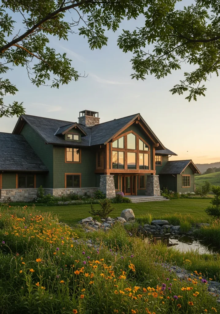 This beautiful green home exudes rustic charm with its combination of stone accents and natural wood details. The rich green exterior is paired perfectly with a stone foundation and wooden beams, creating a warm, inviting look. The large windows provide panoramic views of the surrounding landscape, while the modern architectural style keeps it fresh and contemporary. The lush garden in front, with vibrant wildflowers and carefully manicured greenery, complements the natural feel of the home, creating a peaceful retreat.
