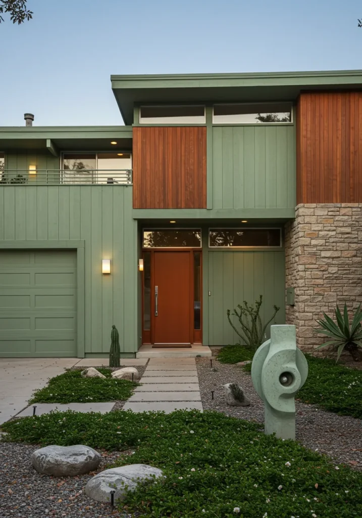 This stunning green home combines modern materials and sleek design, resulting in an eye-catching, minimalist aesthetic. The crisp green exterior is paired beautifully with warm wooden accents and natural stone, providing an elegant yet earthy vibe. The clean, geometric lines and large glass windows create a seamless connection with the outdoor space, while the contemporary sculptures and carefully placed landscaping add a unique touch. The thoughtfully designed pathway leading to the entrance complements the modern feel of the home.