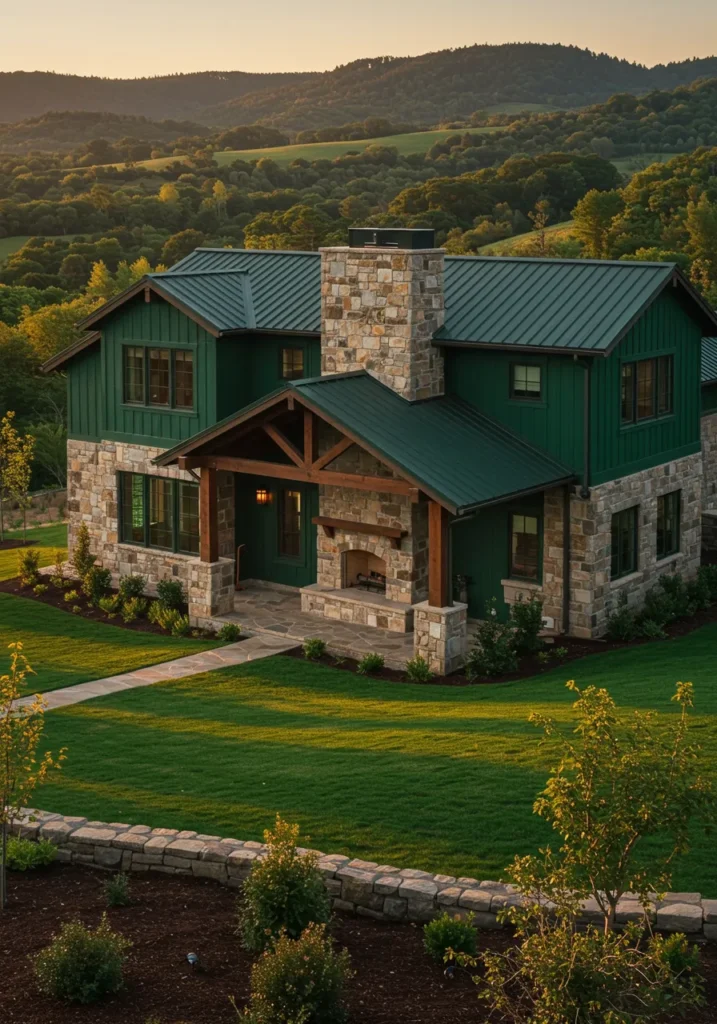 What I love most about this design is the cozy yet luxurious vibe it gives off. The green color brings a refreshing pop of nature, and the stonework makes it feel grounded and timeless. It’s the perfect blend of modern and rustic elements. I can already picture myself spending lazy afternoons by the fireplace, surrounded by the beauty of the outdoors. If you’re someone who enjoys a mix of elegance and comfort, this home might just be your dream come true!