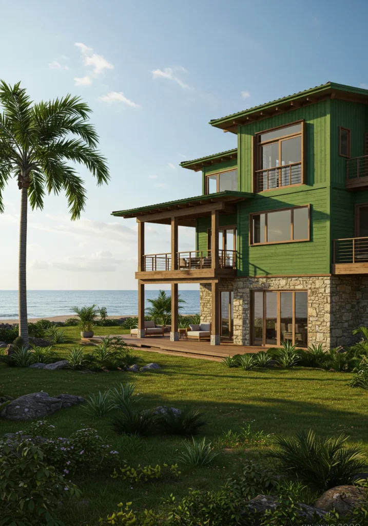 This contemporary home blends the beauty of nature with modern design, all wrapped in a bold green exterior. The house is perched on a lush, well-maintained lawn with an open, inviting layout, featuring a spacious wooden deck perfect for outdoor living. Large windows and glass doors provide an unobstructed view of the ocean, while the stone accents and wood trim add a touch of warmth and sophistication. The home’s design is enhanced by a mixture of clean lines, bold angles, and natural materials like stone and wood, giving it a grounded, yet modern vibe.