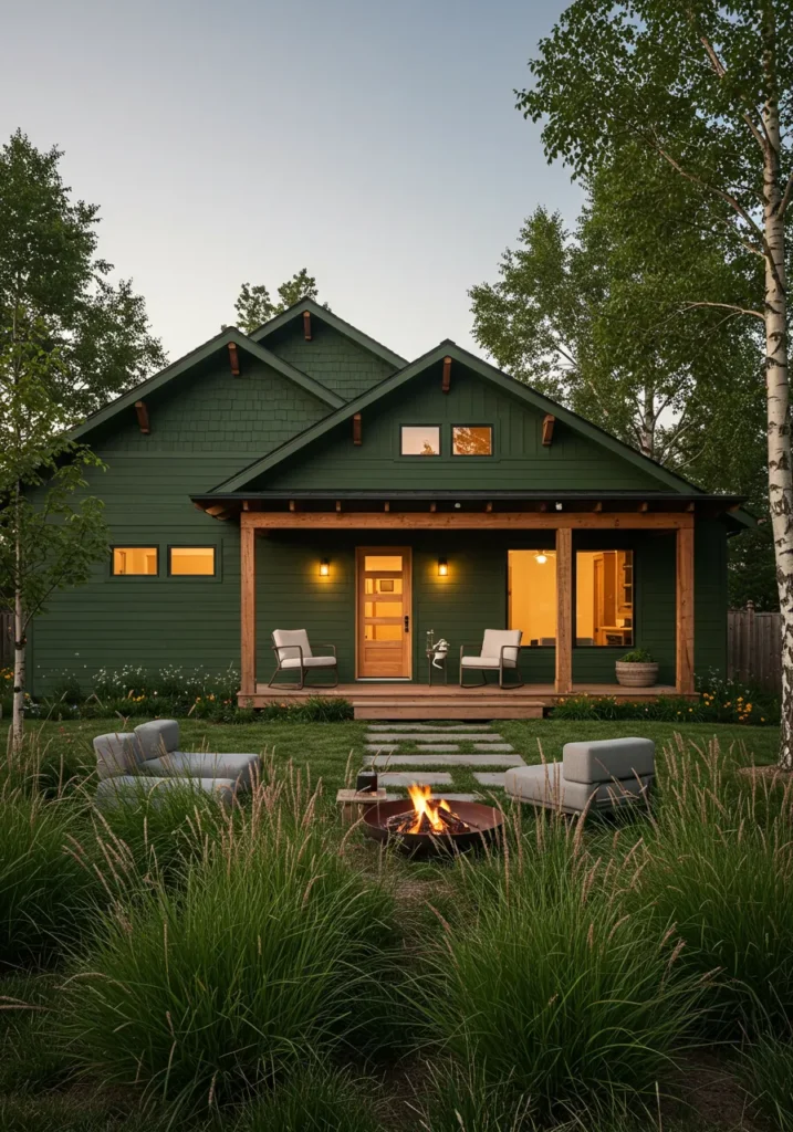 This beautiful green home captures a cozy yet contemporary vibe with its charming exterior and inviting design. The deep green walls contrast beautifully with the natural wood accents and soft landscaping. A lovely porch area is framed by large windows that invite the outdoors in, and the fire pit in the garden creates the perfect space for cozy evenings under the stars. The clean, modern lines of the house are balanced by the lush grass and garden surrounding it, making it feel warm and welcoming.