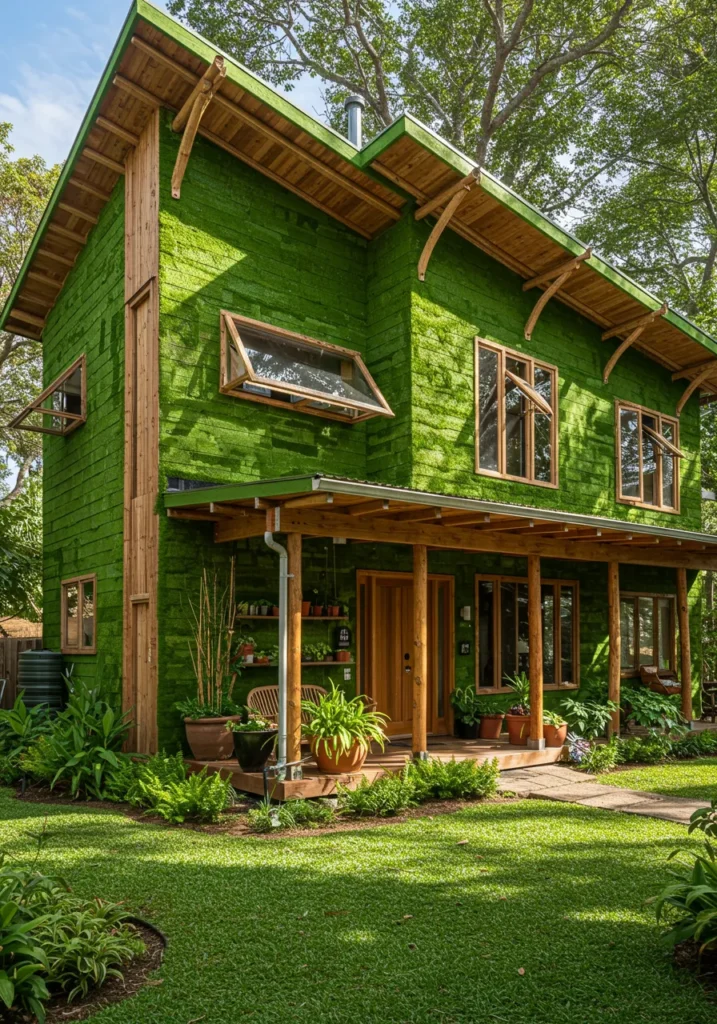 This one-of-a-kind green home features lush living walls that make a bold statement in both design and sustainability. The exterior is covered in vibrant greenery, creating a natural, textured look that perfectly blends the house into its environment. The combination of green walls with wood framing and large windows allows for a harmonious mix of nature and modern design. A cozy front porch with wooden beams invites you to relax, while the carefully tended plants and greenery around the home add a fresh and calming vibe.