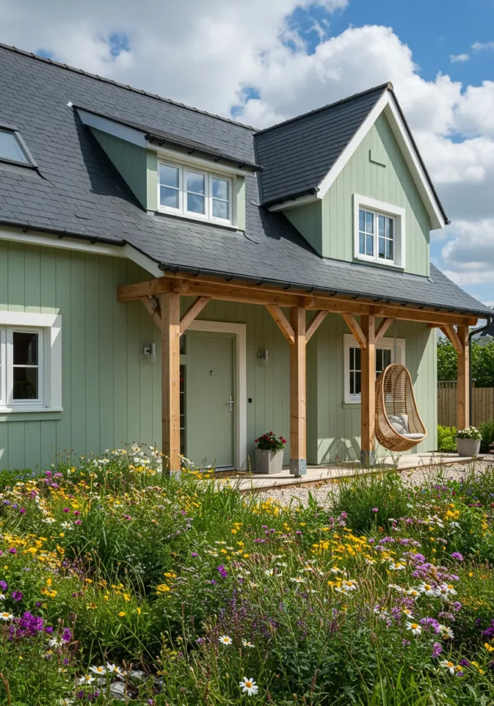 I am completely in love with this design! The soft green color is so refreshing and vibrant, and it’s complemented perfectly by the natural wooden accents. It gives off such a welcoming vibe, and I can already imagine myself relaxing on the front porch surrounded by those lovely flowers. It’s modern, yet still cozy and warm—exactly what I would want in a home! The attention to detail with the landscaping just ties everything together beautifully. What a stunning design!