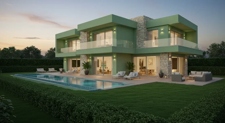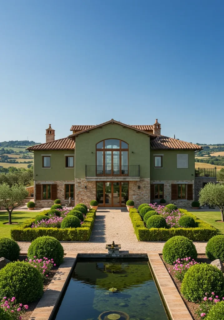 This luxurious villa combines rustic elegance with sophisticated design. The beautiful green facade, complemented by classic stone accents, creates a harmonious blend of modern style and timeless beauty. The grand entrance is flanked by neatly manicured garden beds, with symmetrical rows of lush greenery and colorful flowers guiding your eye towards the stunning arched windows. A serene water feature sits in front, adding an extra touch of calm to the space, while the expansive windows and balconies invite natural light into every corner of the home.