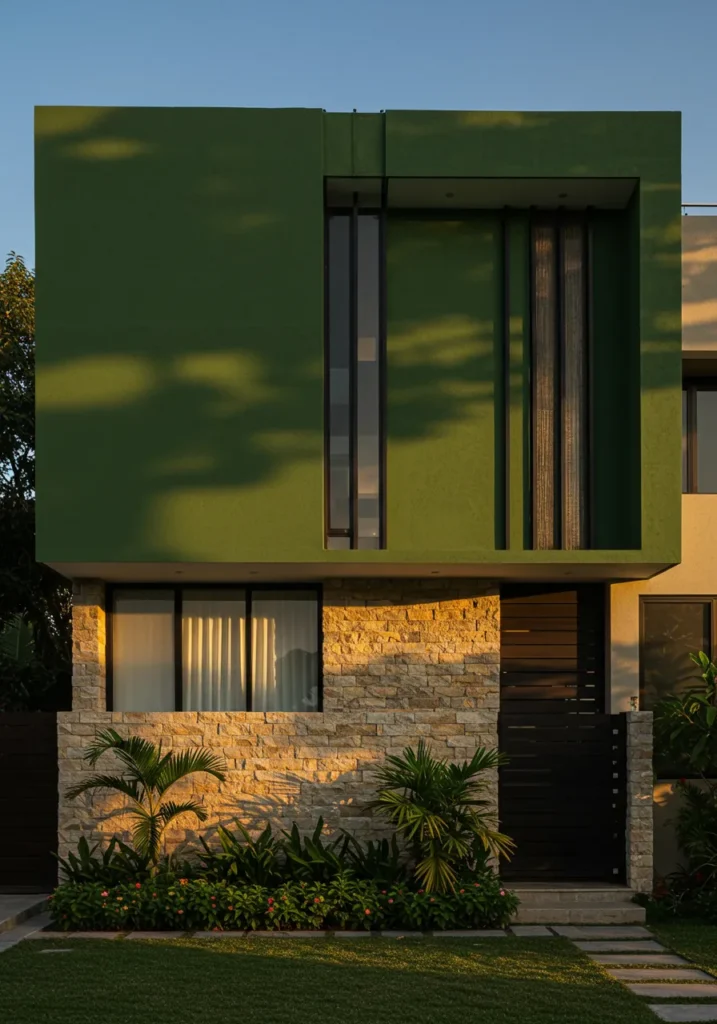 I absolutely love how this design blends clean, modern aesthetics with the natural beauty of the green color and stone accents! The bright, welcoming lights combined with the sophisticated architectural elements make it feel like a sanctuary in the midst of nature. There’s something so peaceful and inviting about this home. I can easily picture myself sipping coffee on that front porch, soaking in the beauty of the surroundings. The combination of modern elegance and earthy tones? Totally a dream come true.