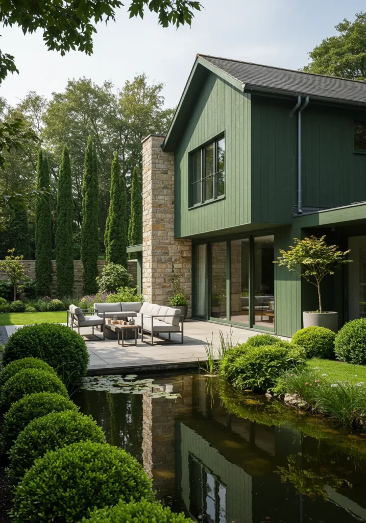 This modern home features a stunning green exterior with a unique combination of textures and materials. The sleek green siding contrasts beautifully with the natural stone chimney and columns, creating a chic yet warm appearance. The expansive glass doors open to a serene patio, which is set alongside a reflective pond and perfectly manicured shrubbery. The tall, slender trees in the background frame the house in a way that makes it feel connected to the nature around it, adding both elegance and tranquility.