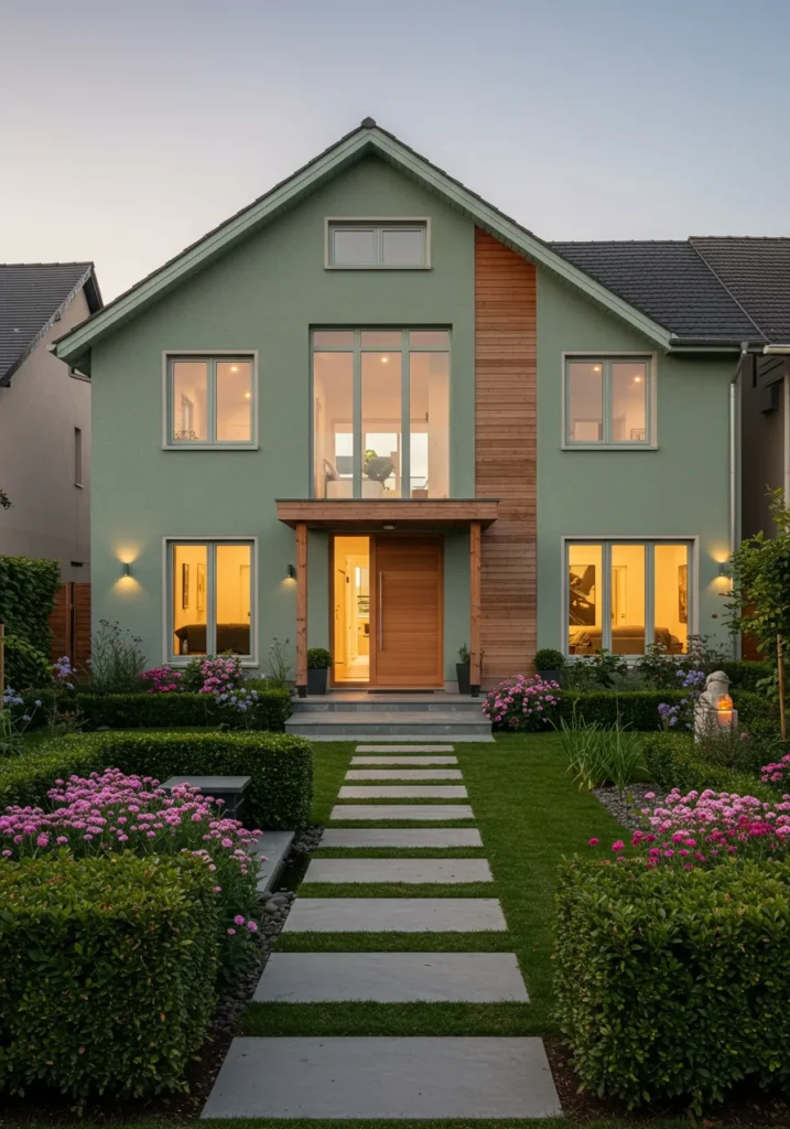 This gorgeous modern home strikes the perfect balance between sleek design and natural elements. The soft green exterior creates a calming effect, while the addition of warm wooden panels adds an inviting, earthy touch. The grand front entryway, with its wooden door and stone steps, draws you in, while the well-maintained garden with blooming flowers adds a pop of color. The large windows flood the space with light, making this home feel airy and open, all while blending seamlessly with the beautiful landscaping around it.