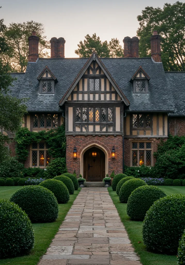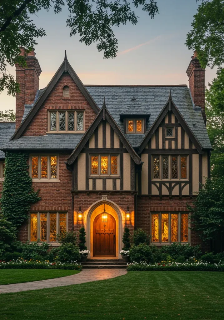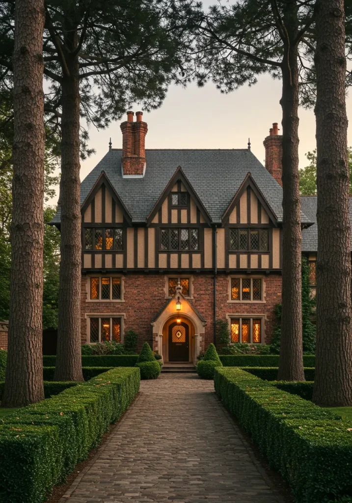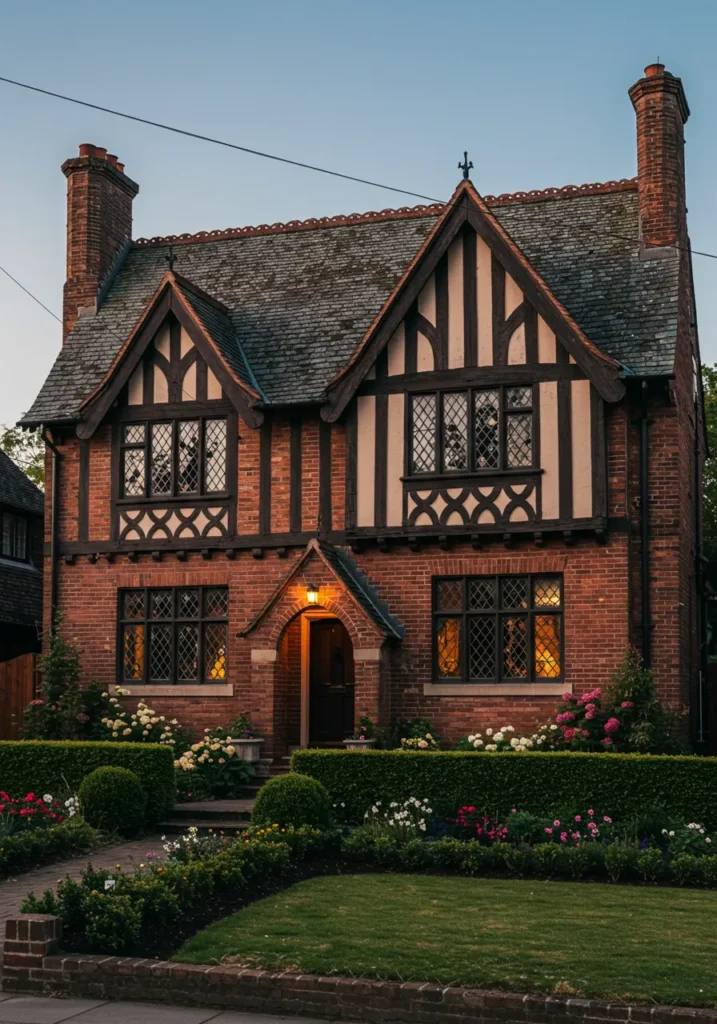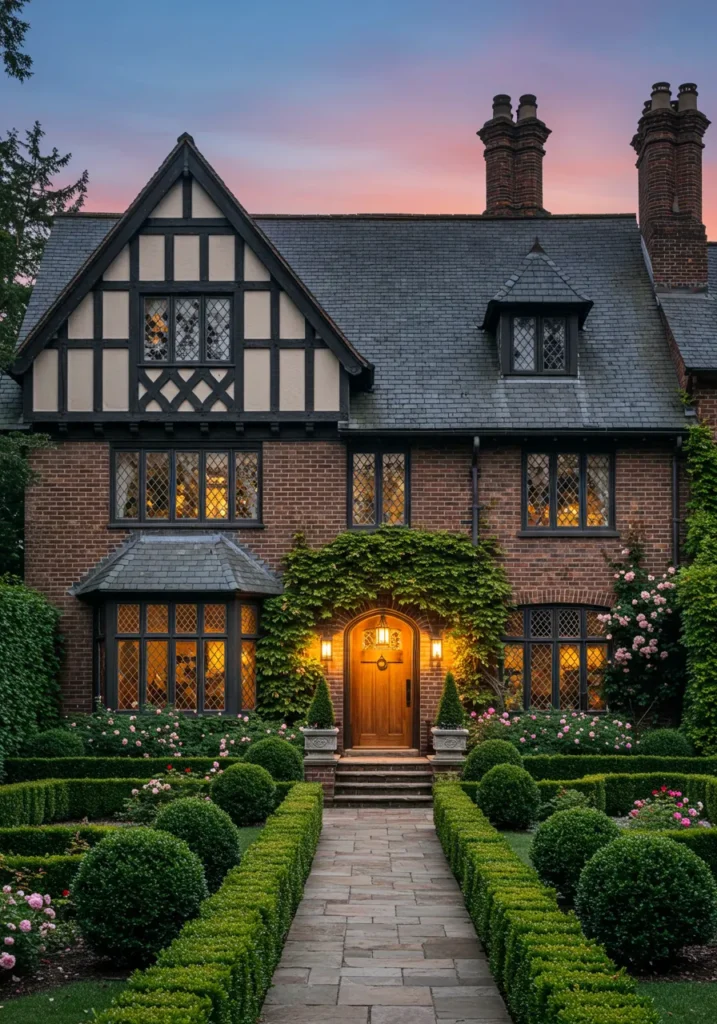 This beautiful Tudor-style home features an intricate blend of brick and woodwork, giving it a timeless appeal. The tall, steep roof adds an air of sophistication, while the charming stone archway at the entrance beckons you inside. The surrounding garden is meticulously designed, with perfectly shaped hedges and lush greenery framing the path leading to the front door. The warm glow of the lights coming from within highlights the home’s inviting and cozy feel, making it as welcoming as it is impressive.