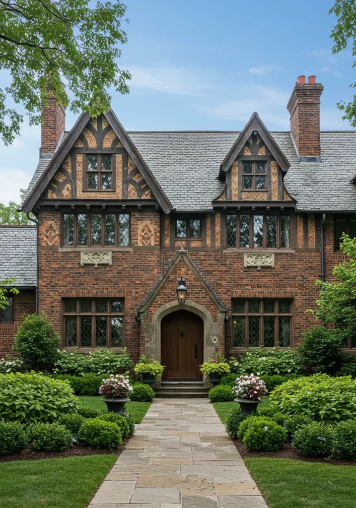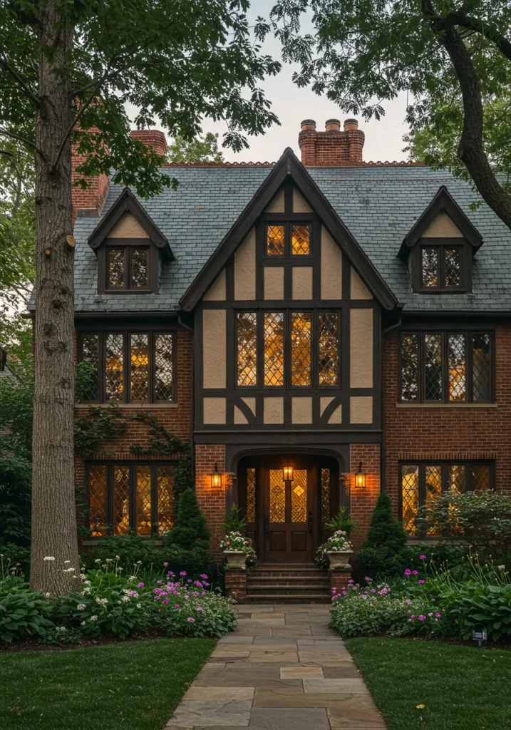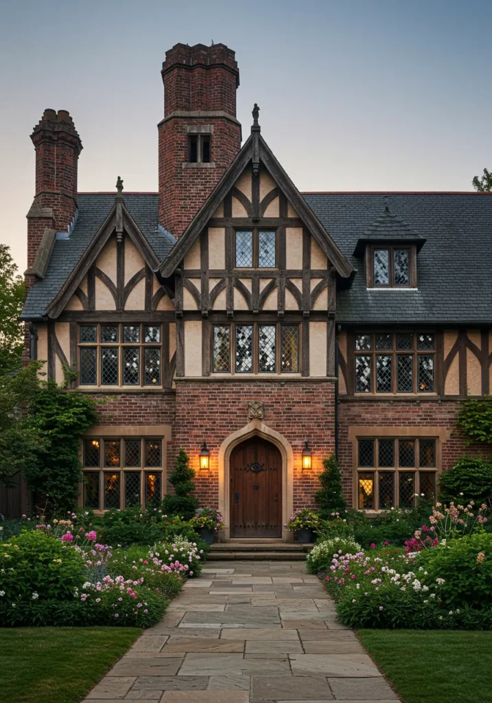 This charming Tudor home combines classic design with stunning details. The exterior features a perfect balance of rich brick and intricate timber framing, which is the signature of this style. Tall, narrow windows with diamond patterns add a touch of elegance, while the steep gables and tall chimneys give it a grand yet inviting presence. The pathway leading to the door is lined with lush greenery and delicate flowers, creating a warm and welcoming vibe as it leads up to the wooden, arched front door.