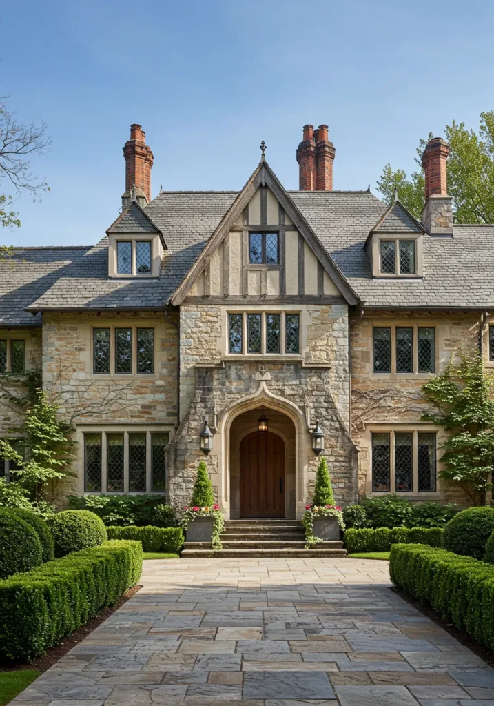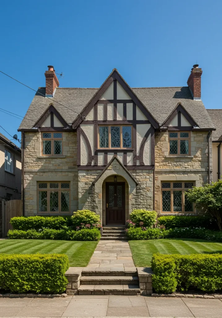 This stunning Tudor-style home blends natural stone with classic timber accents, offering a balance of grandeur and warmth. The detailed stonework on the lower level of the house contrasts beautifully with the lighter, cream-colored upper section, where dark wooden beams create that iconic Tudor pattern. The charming archway leading to the front door is flanked by vibrant, well-maintained greenery, and the diamond-shaped windows add a touch of vintage elegance. The neatly trimmed hedges and manicured lawn enhance the home’s inviting feel, leading to a front step that promises a warm welcome.